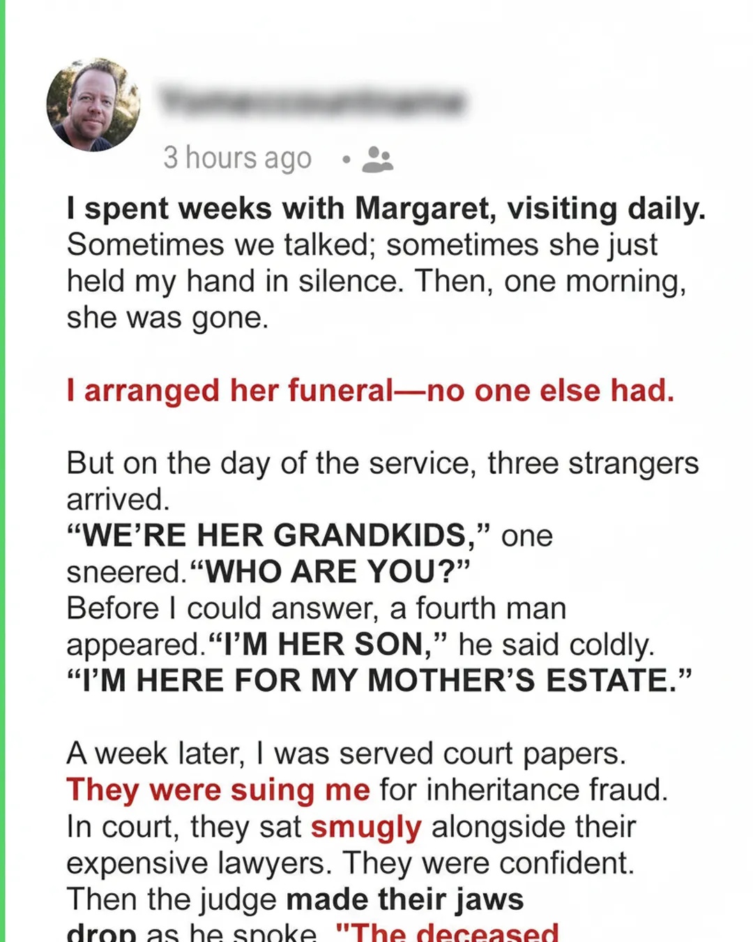 I was stunned. I had never met them before. A week later, I received court papers — they were challenging me over inheritance, convinced I had taken something that wasn’t mine. I didn’t argue. I simply brought everything I had — the letters, the receipts, the small mementos Margaret had given me — and let the truth speak for itself. When the judge read her will, the room fell silent. Margaret had left her estate not to me, but to a community charity in our town, in memory of her late husband.