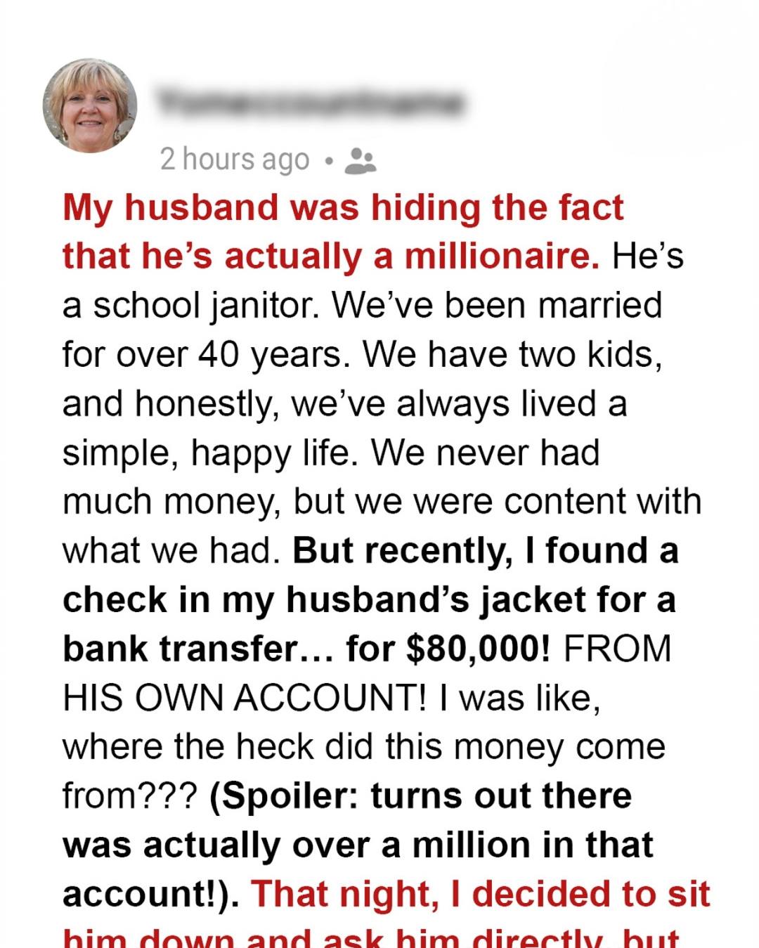 After forty-three years of marriage, I thought I knew everything about my husband, Tom. We built a simple life together — he worked as a school janitor, and I sold clothes at the department store. Our home wasn’t grand, but it was filled with laughter, memories, and the quiet pride that comes from honest work. So when I found a bank receipt showing an $80,000 transfer from Tom’s account to a charity I’d never heard of, my heart nearly stopped. How could a man who counted every penny have that kind of money?