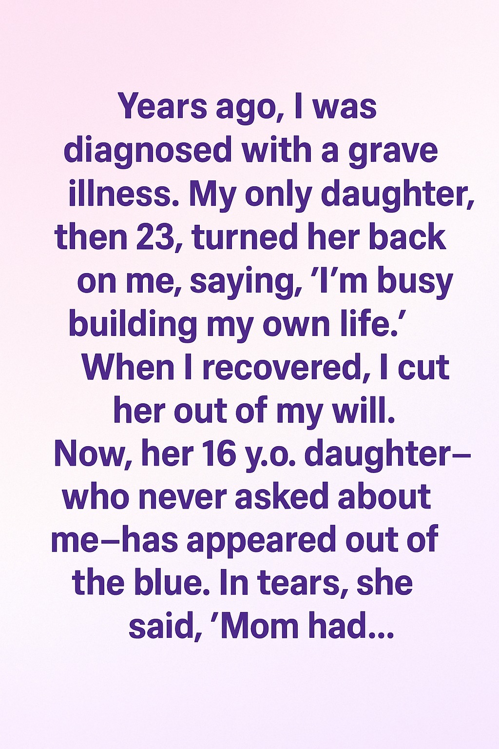 Years ago, I was diagnosed with a grave illness. My only daughter, then 23, turned her back on me, saying, ‘I’m busy building my own life.’ When I recovered, I cut her out of my will. Now, her 16 y.o. daughter—who never asked about me—has appeared out of the blue. In tears, she said, ‘Mom had…’ “…told me you didn’t want anything to do with us. She said you abandoned her when she needed you.