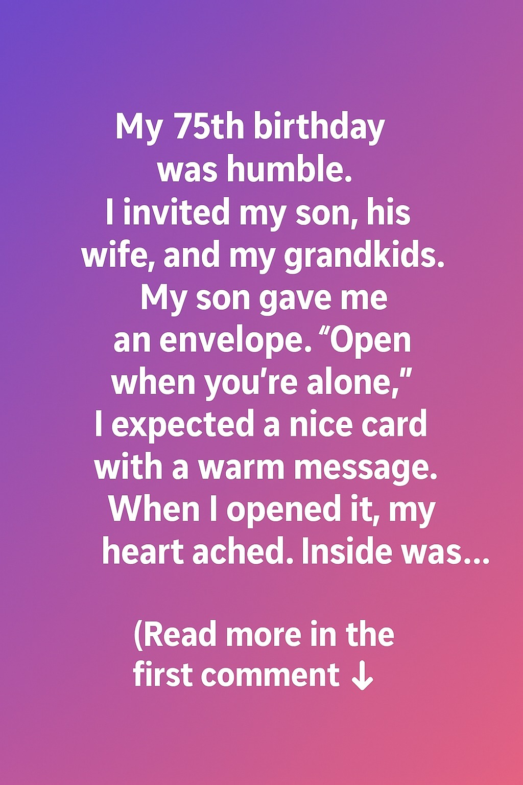 My 75th birthday was humble. I invited my son, his wife, and my grandkids. My son gave me an envelope. “Open when you’re alone,” I expected a nice card with a warm message. When I opened it, my heart ached. Inside was…a formal notice asking me to consider selling my home and moving into a retirement facility. No handwritten note, no personal words — just a printed form and a short typed line: “Dad, this will be best for everyone.” I sat there at my kitchen table, the same one where he once ate cereal before school, feeling a wave of sadness wash over me. It wasn’t anger — just the deep loneliness that comes when you realize the world sees you as old before you do.