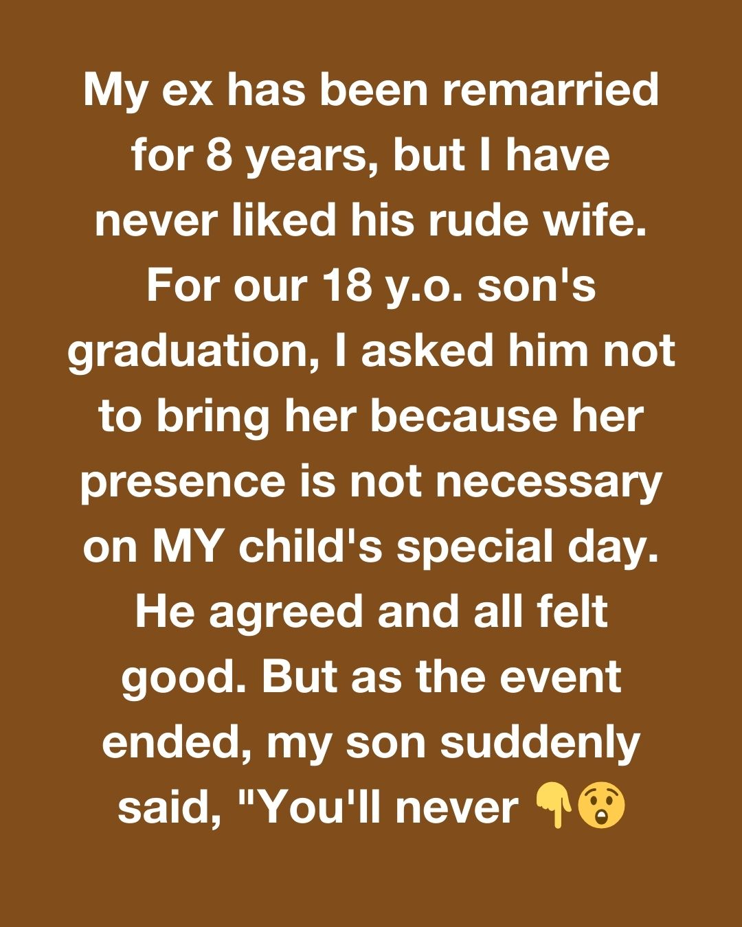 My ex has been remarried for eight years, but I have never liked his rude and condescending wife. For our 18-year-old son’s graduation, I asked him not to bring her because her presence was not necessary on MY child’s special day.
